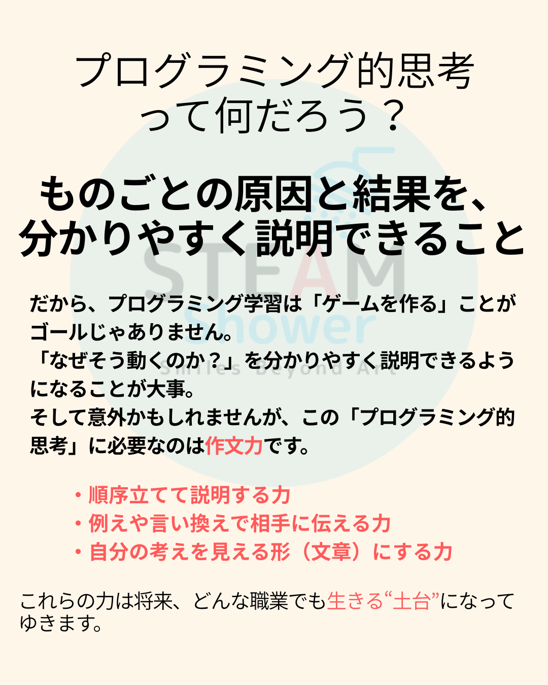 そして意外かもしれませんが、この「プログラミング的思考」に必要なのは作文力です。