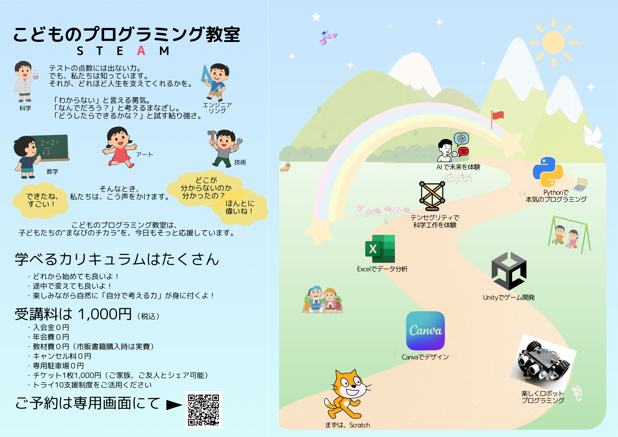Scratchでの基礎から始め、ロボット(micro:bit)、デザイン(Canva)、データ整理(Excel)、本格的なコード(Python)まで。